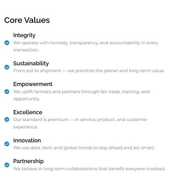 To become a world-recognized brand in agro-exports and renewable bio-energy solutions, known for excellence, traceability, innovation, and ethical business practices.